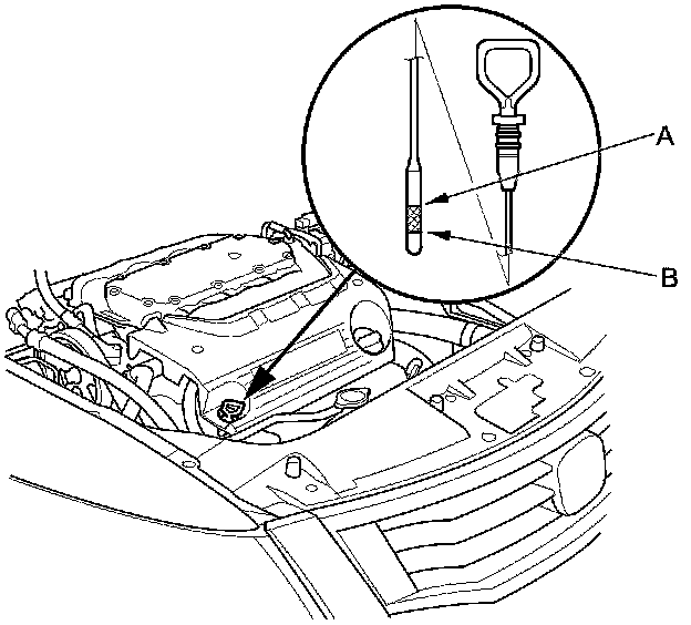 3. Remove the dipstick, and check the engine oil level. It should be between the upper mark (A) and the lower mark (B).