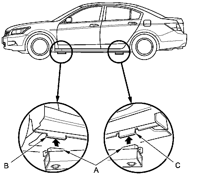 1. Position the lift pads (A) under the vehicle's front support points (B) and rear support points (C).
