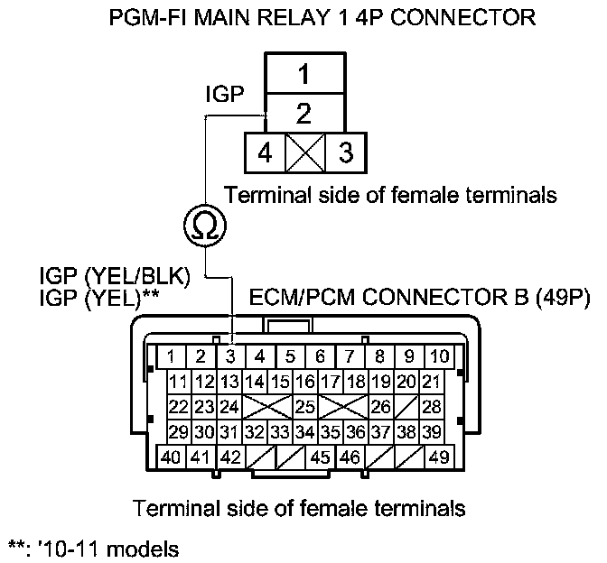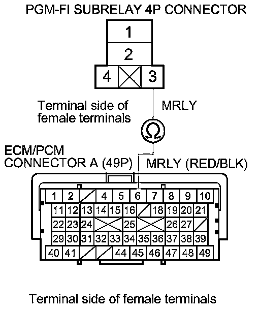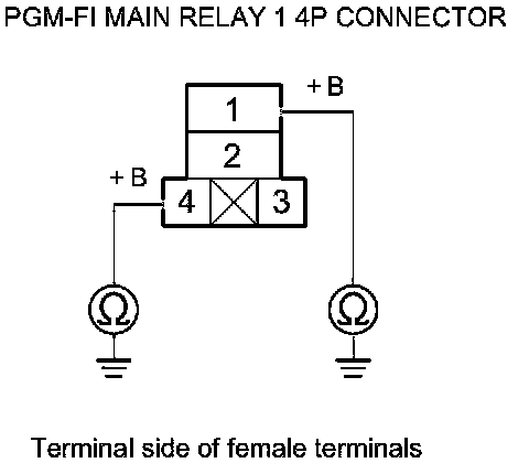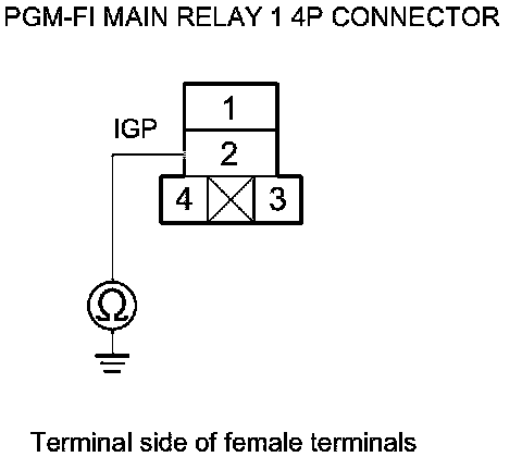 38. Check for continuity between body ground and PGM-FI main relay 1 4P connector terminals No. 1 and No. 4 individually.
