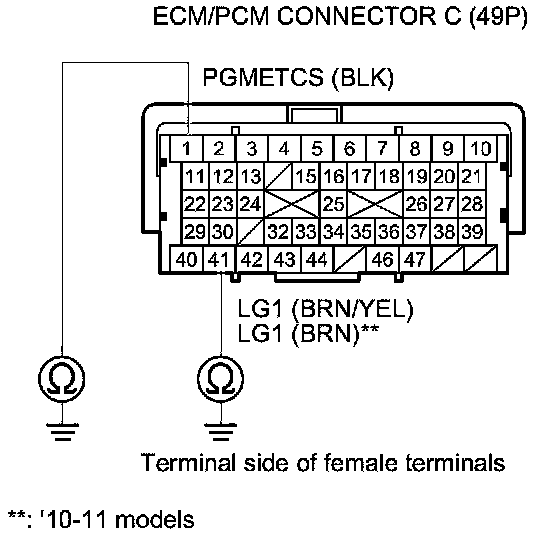 69. Check for continuity between body ground and ECM/PCM connector terminals A41, B1, B40, B41, C1, and C41 individually.