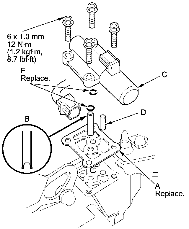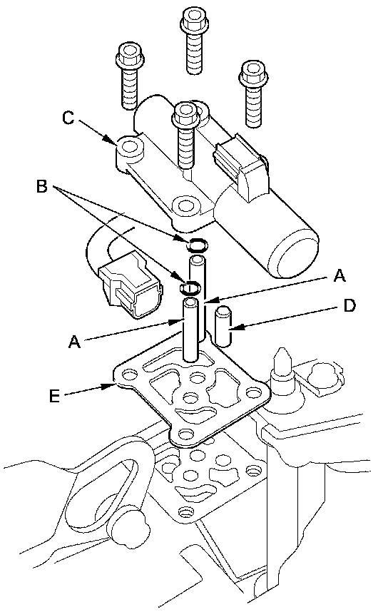 10. Remove A/T clutch pressure control solenoid valve C, the ATF pipes (A), the O-rings (B), the ATF joint pipe (D), and the gasket (E).