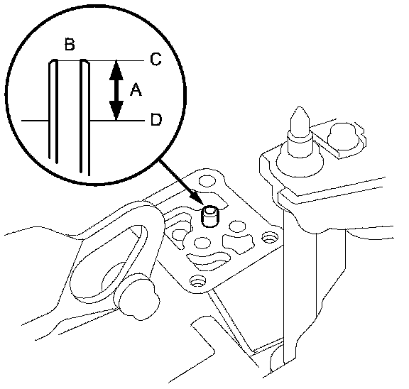 16. Check the height (A) of the 8 x 53 mm ATF pipe (B) between the top (C) of the pipe and the solenoid valve body mounting surface (D). The height is about 7.0 mm (0.28 in). If the height is over 7.0 mm (0.28 in), push the pipe until it bottoms in the accumulator body.