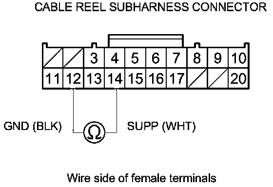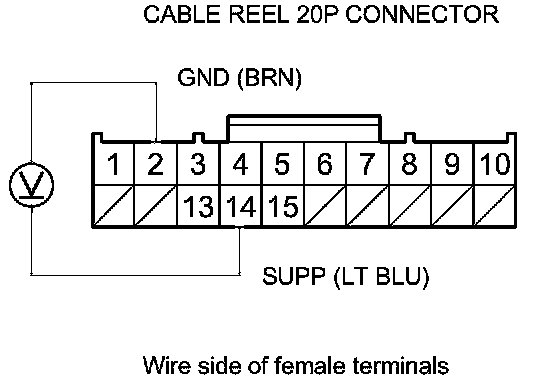 9. Measure the voltage between cable reel 20P connector terminal No. 2 and No. 14.