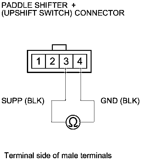 4. Check for continuity between paddle shifter + (upshift switch) connector terminals No. 3 and No. 4 when pressing and releasing the paddle shifter + (upshift switch).