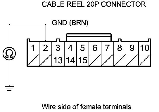 6. Check for continuity between cable reel 20P connector terminal No. 2 and body ground.