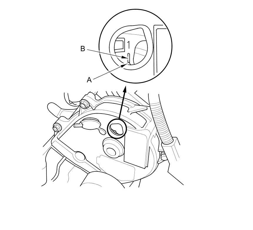 No. 1 piston TDC mark (B) on the front camshaft pulley.