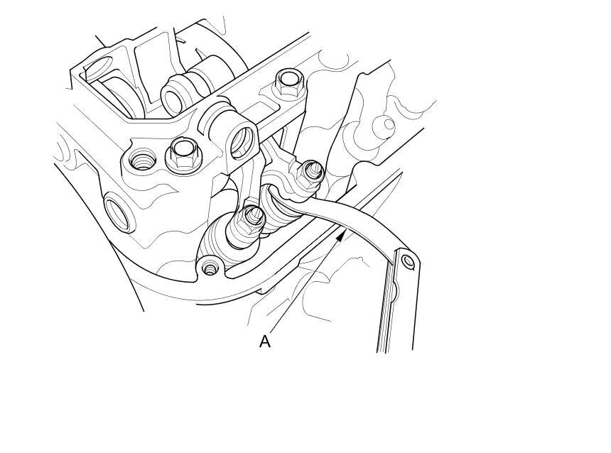 4. Insert the feeler gauge (A) between the adjusting screw and the end of the valve stem on the No. 1 cylinder, and slide it back and forth; you should feel a slight amount of drag.