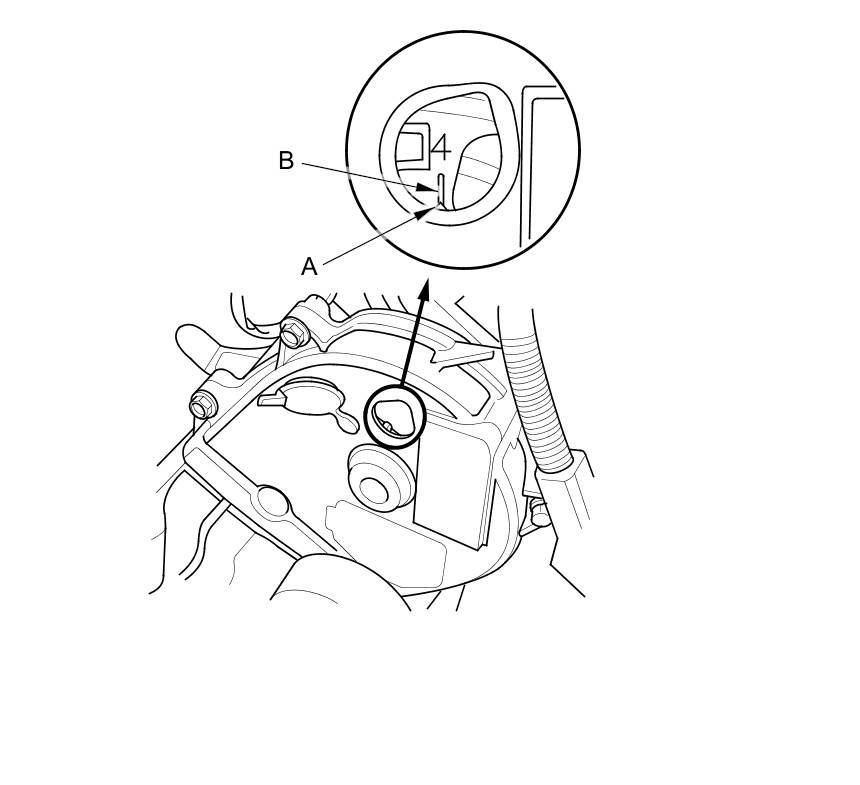7. Rotate the crankshaft clockwise. Align the pointer (A) on the front upper cover with the No. 4 piston TDC mark (B) on the front camshaft pulley.