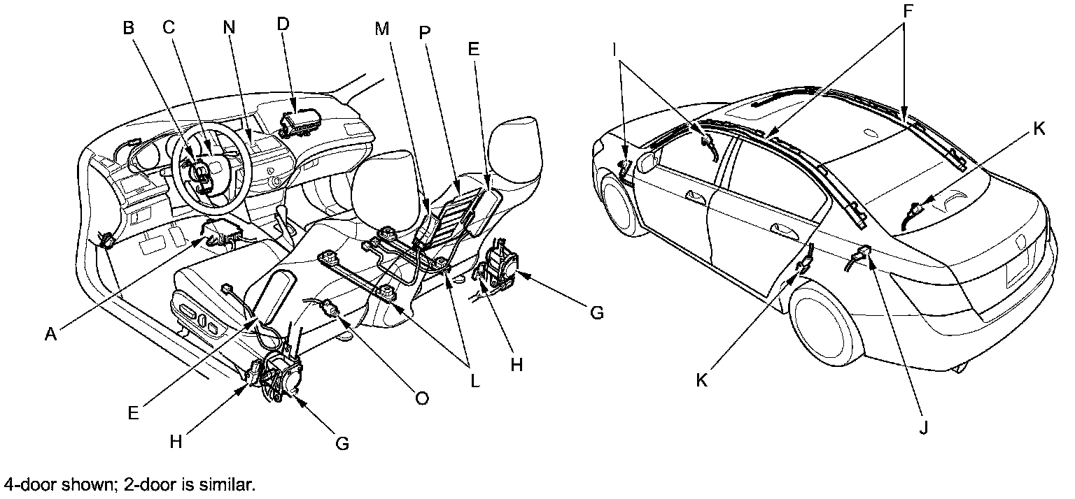 The SRS is a safety device which, when used with the front seat belts, is designed to help protect the driver and front passenger in a frontal impact exceeding a certain set limit. The system consists of the SRS unit (A), including safing sensor and impact sensor, the cable reel (B), the driver's airbag (C), the front passenger's airbag (D), the side airbags (E), the side curtain airbags (F), the front seat belt tensioners (G), the side impact sensors (first) (H), the front impact sensors (I), the rear safing sensor (J), and the side impact sensors (second) (K).