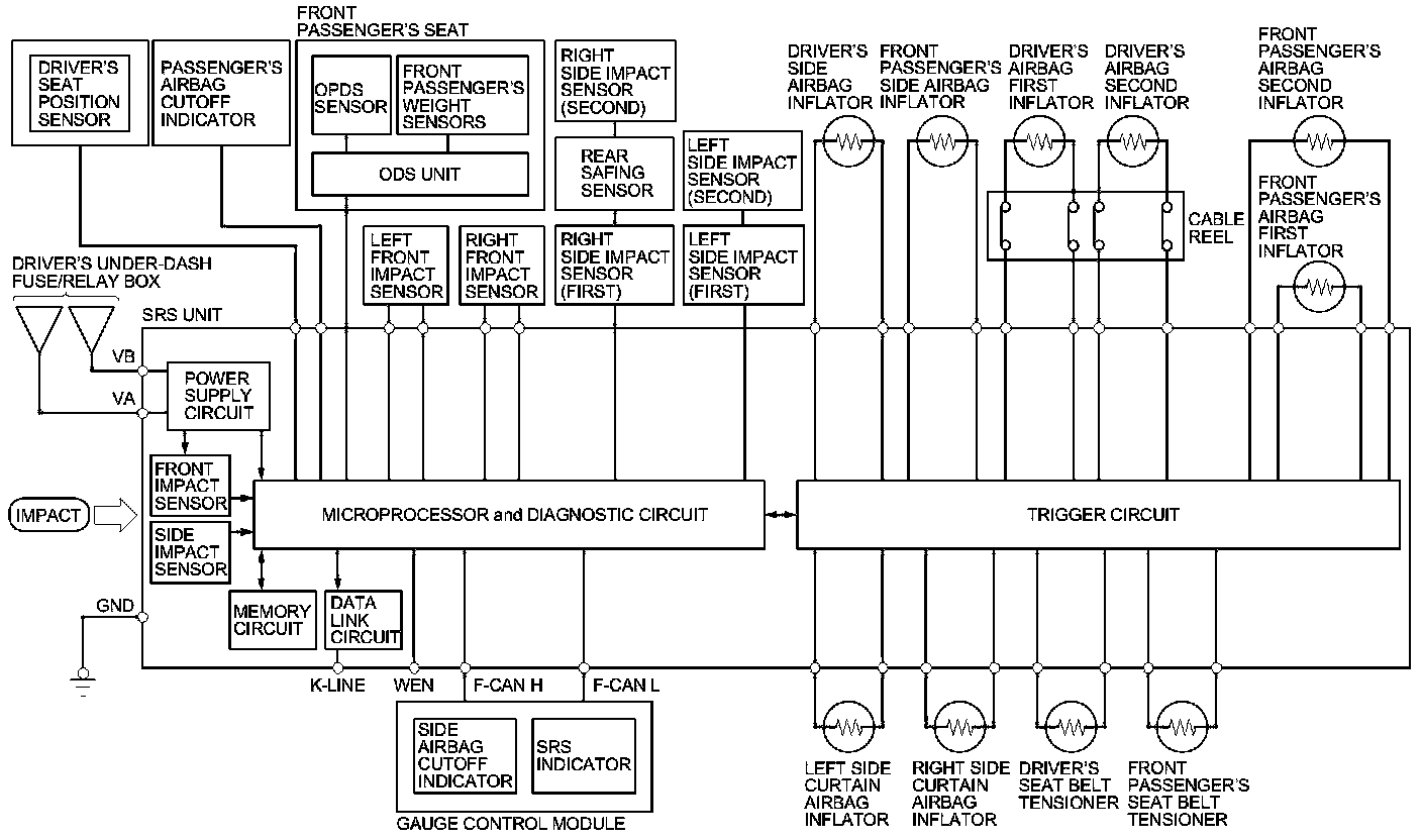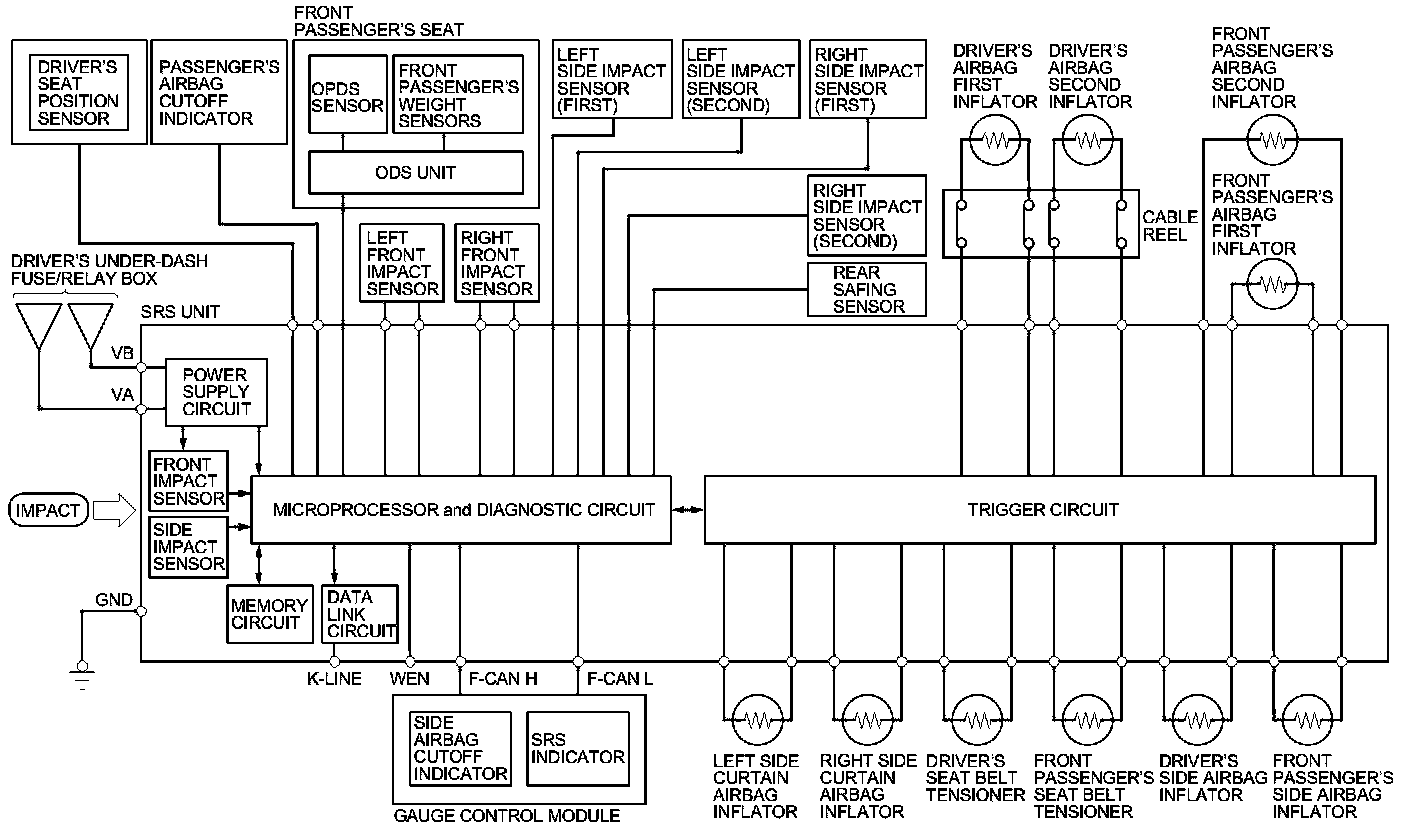 The main circuit in the SRS unit senses and analyzes the force of impact and, if necessary, ignites the inflator charges. If battery voltage is too low or power is disconnected due to the impact, the voltage regulator and the back-up power circuit will keep voltage at a constant level.