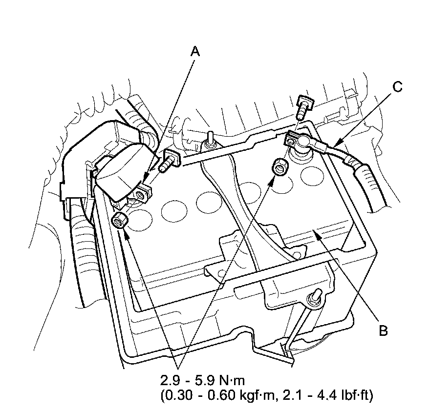 3. Reconnect the positive cable (A) to the battery (B) first, then reconnect the negative cable (C) to the battery.