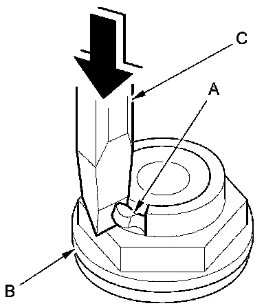 17. Cut the lock tab (A) off the mainshaft locknut (B) using a chisel (C).