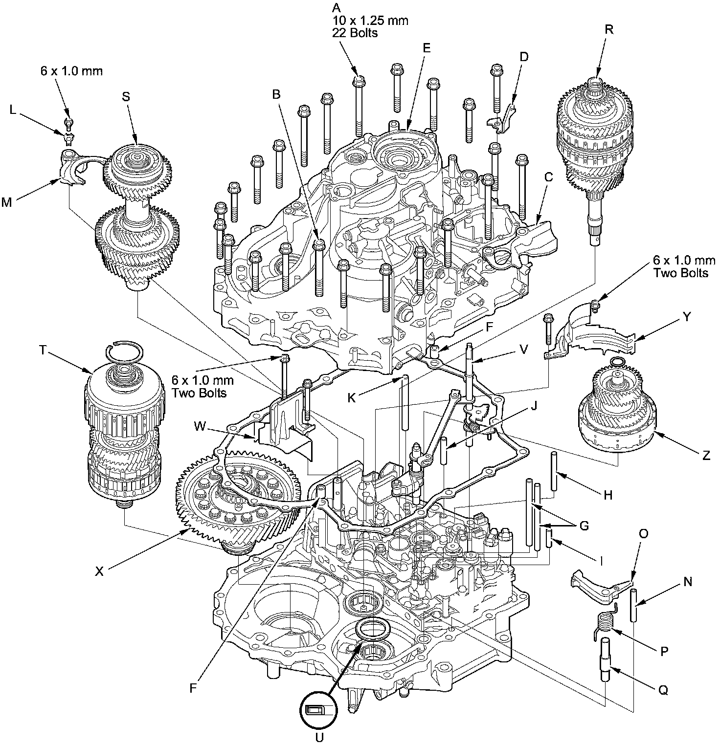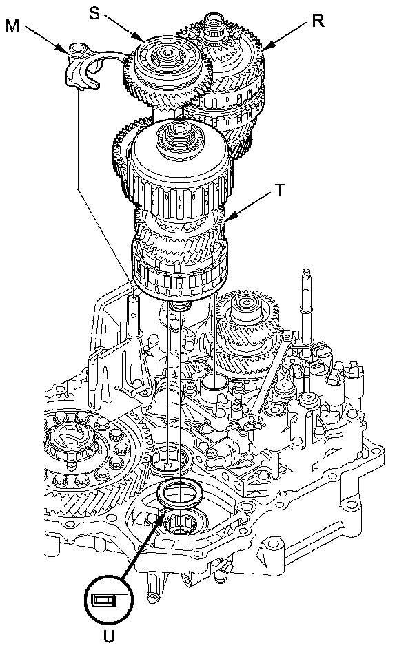 29. Remove the mainshaft (R), the countershaft (S), the shift fork (M), and the secondary shaft (T) together, and remove the needle bearing (U) from the torque converter housing.