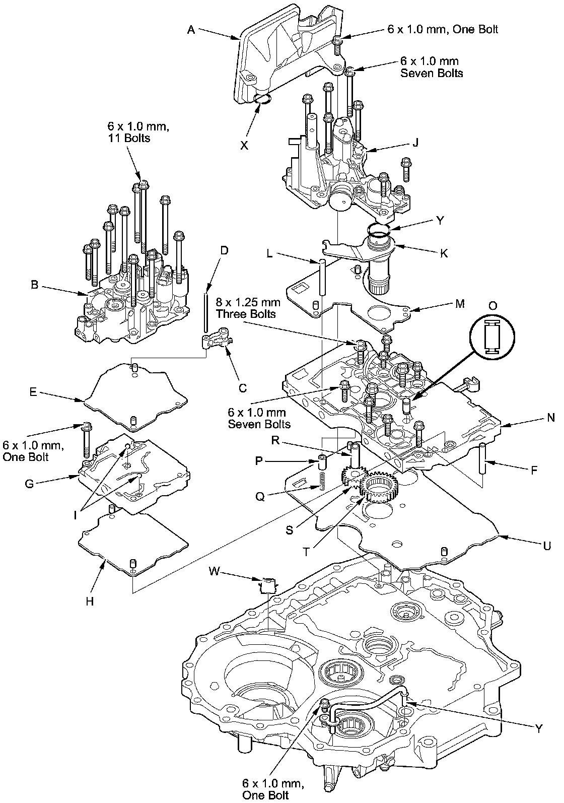 12. Remove the end cover (W) (three bolts), the snap ring cap (X) (two bolts), the sealing plug (Y), and the sealing washer (Z).