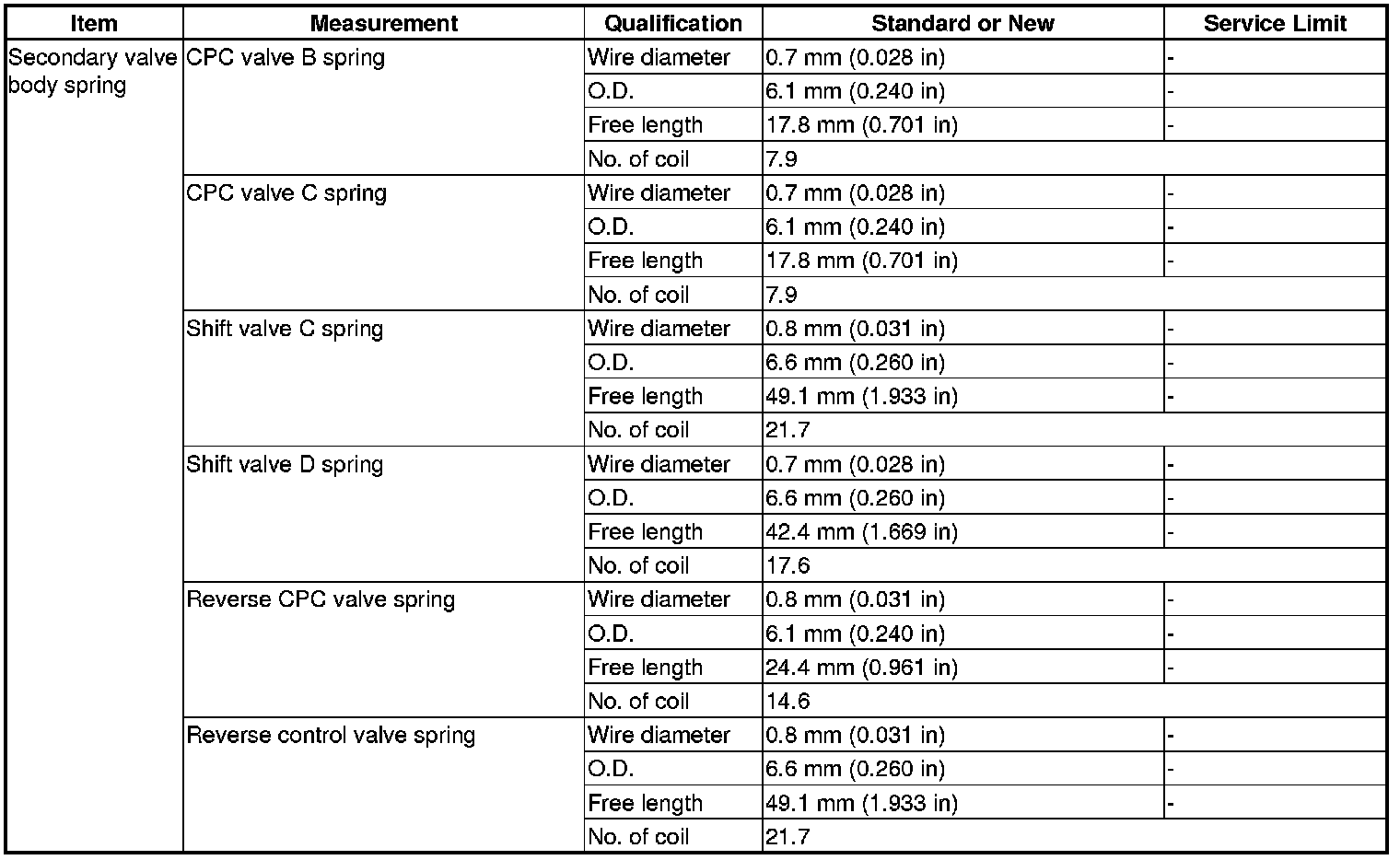 Secondary Valve Body Spring Specification(s) (A/T)