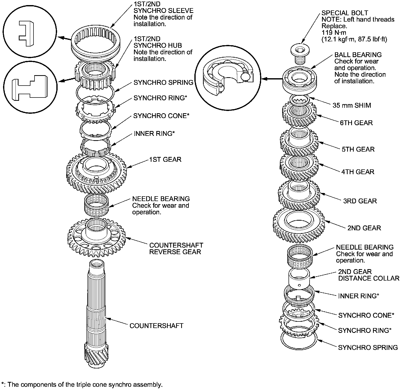NOTE: Make sure to align the slots in the 1st/2nd synchro hub as shown.