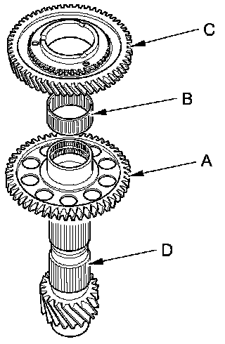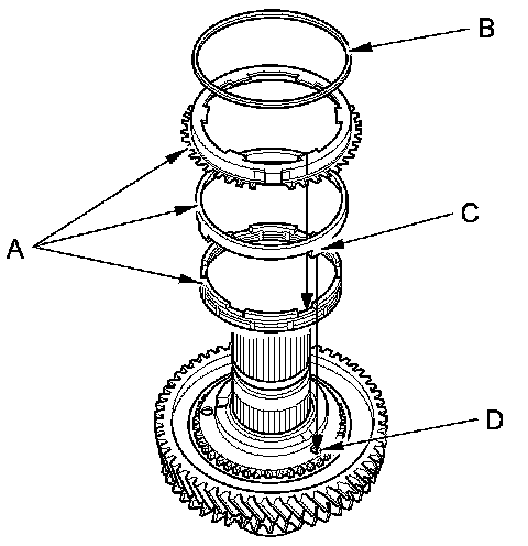 3. Install the triple cone synchro assembly (A) with the synchro spring (B) by aligning the synchro cone fingers (C) with the holes (D) in 1st gear.
