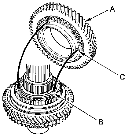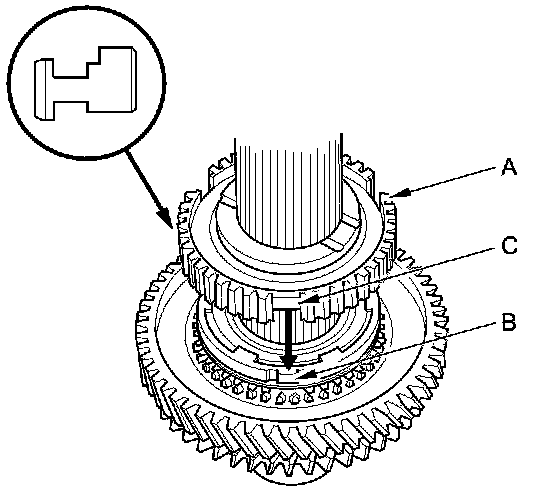 8. Install 2nd gear (A) by aligning the synchro cone fingers (B) with the holes (C) in 2nd gear.