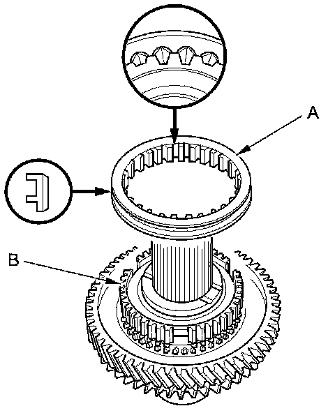 5. Install the 1st/2nd synchro sleeve (A) by aligning the slots of the 1st/2nd synchro sleeve and the 1st/2nd synchro hub (B). After installing, check the operation of the 1st/2nd synchro hub set.