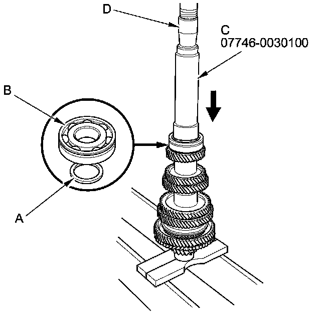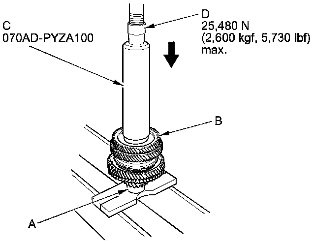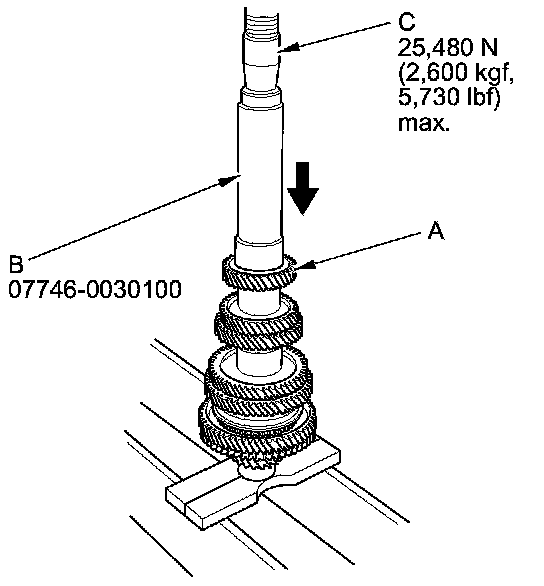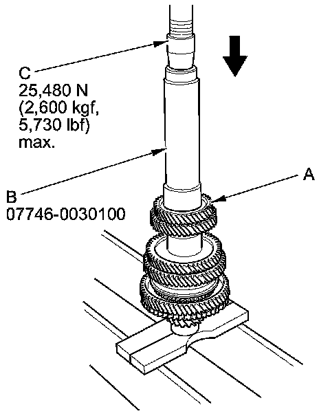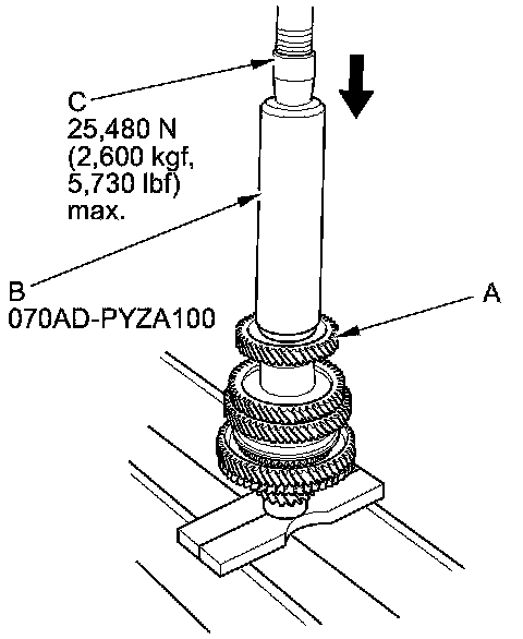 11. Press on 5th gear (A) using the 40 mm I.D. driver handle (B) and a press (C).