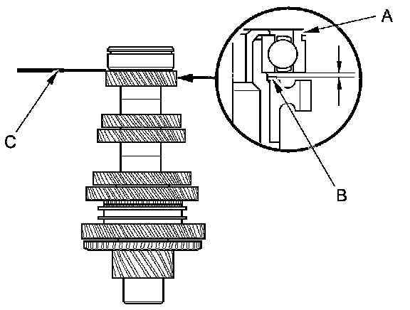 14. Measure the clearance between the ball bearing (A) and the 35 mm shim (B) with a feeler gauge (C).