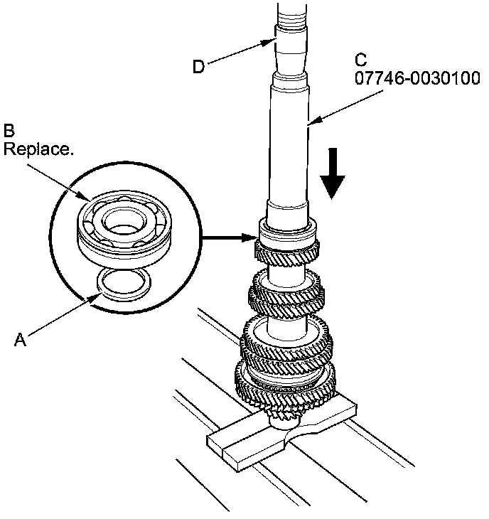 2. Install the countershaft reverse gear (A) with the needle bearing (B), and 1st gear (C) onto the countershaft (D).