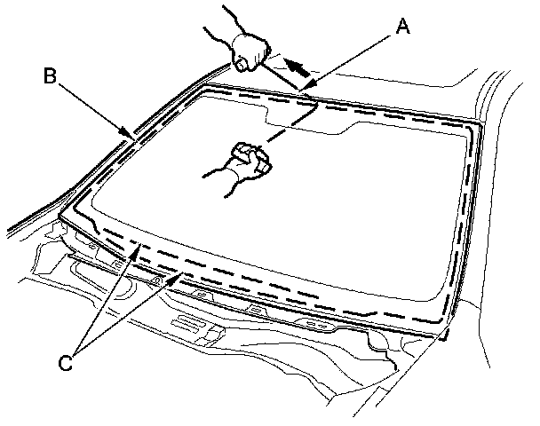 6. With a helper on the outside, pull the piano wire (A) back and forth in a sawing motion. Hold the piano wire as close to the windshield (B) as possible to prevent damage to the body and the dashboard. Carefully cut through the rubber dam and the adhesive (C) around the entire windshield.