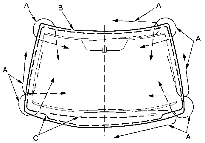12. Apply glass primer to the upper clips mounting areas on the windshield (B), and let it dry. Remove the adhesive backing and attach the rubber dam A and the upper clips (C) to the inside of the windshield as shown: