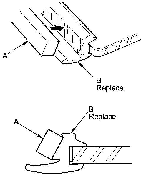 2. Remove the windshield molding (A) from the upper edge of the windshield (B). If necessary, cut the windshield molding with a utility knife.