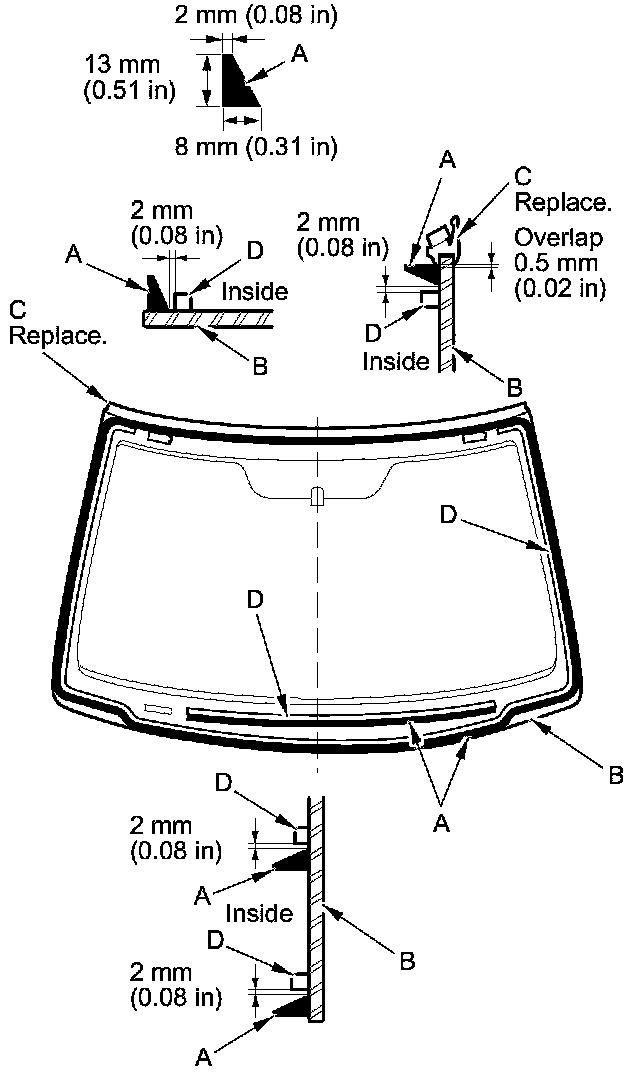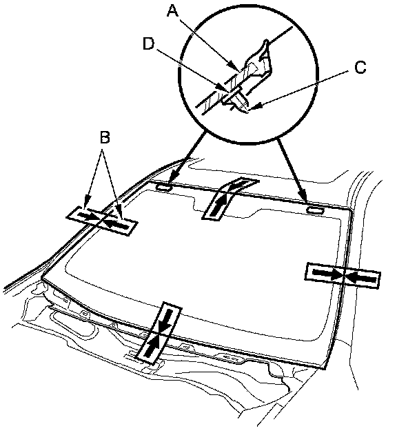 21. Put the cartridge in a caulking gun, and run a continuous bead of the adhesive (A) around the windshield (B) along the edge of the windshield molding (C) and the rubber dams (D) as shown: