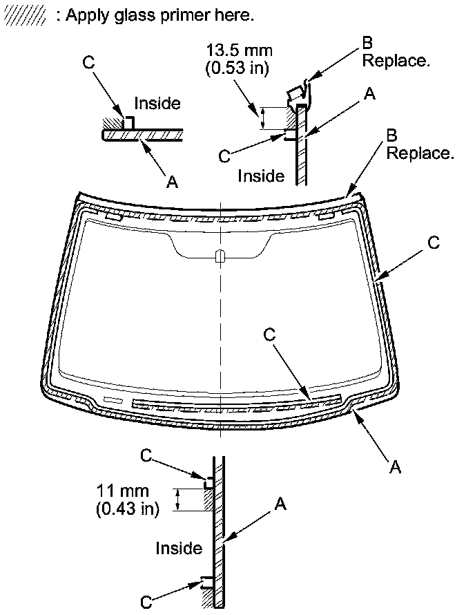 18. Apply a light coat of glass primer to the windshield (A) along the edge of the windshield molding (B) and the rubber dams (C) as shown, then lightly wipe it off with gauze or cheesecloth: