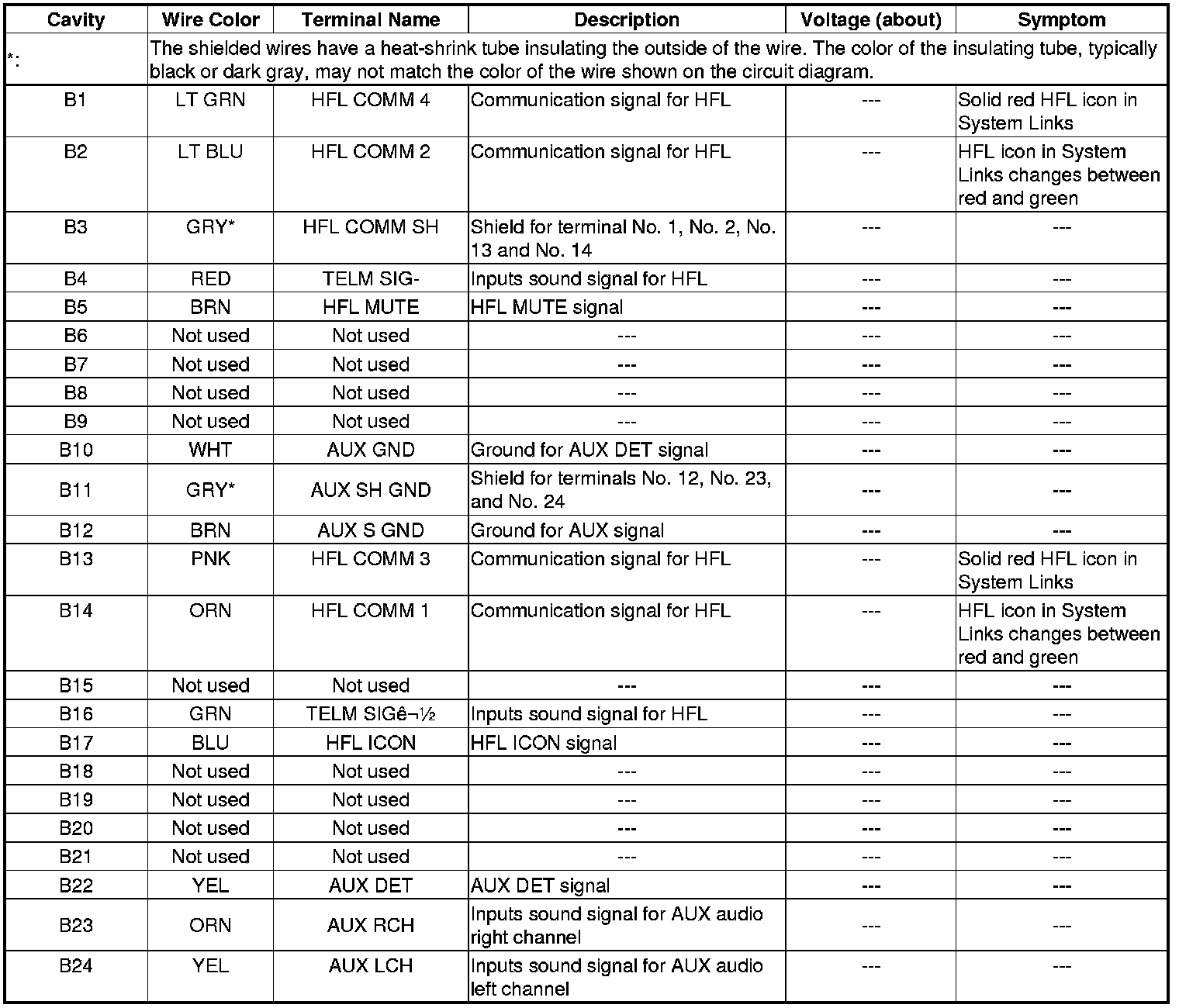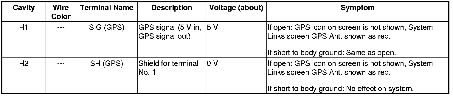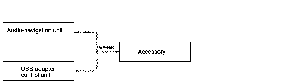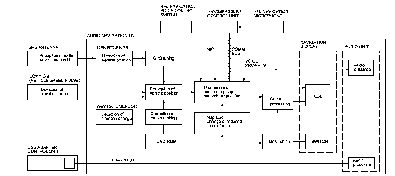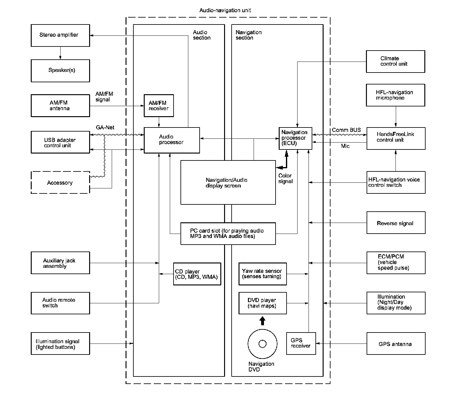 The internal GA-Net II bus passes information back and forth between the navigation display, the audio-navigation unit, the USB adapter control unit, and the audio system components. The information passed on this bus are touch button commands, audio muting signal, audio (radio and USB audio), and any opens or shorts in these bus lines can affect the navigation system or other audio accessory operation.