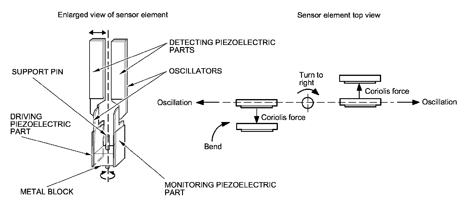 - When the vehicle turns to the right, the sensor element moves in a circular motion with the right oscillator bending forward and the left oscillator bending backward. The amount of forward/rearward bend varies according to the angular velocity of the vehicle.