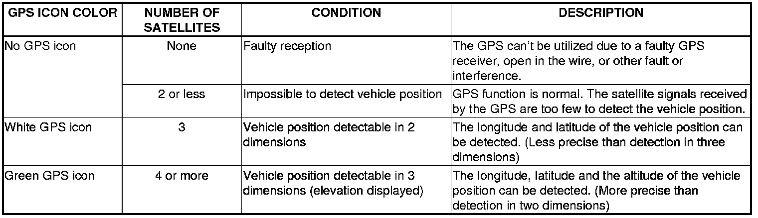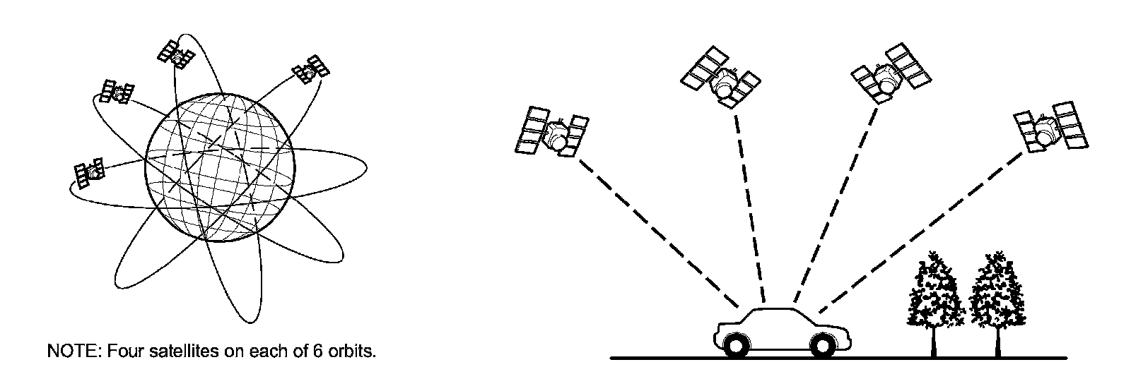 The global positioning system (GPS) enables the navigation system to determine the current position of the vehicle by using the signals transmitted from the satellites in orbit around the earth. The satellites transmit the satellite identification signal, orbit information, transmission time signal, and other information. When the GPS receiver receives a signal from four or more satellites simultaneously, it calculates the current position of the vehicle based on the distance to each satellite and the satellite's position in its respective orbit.