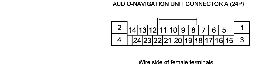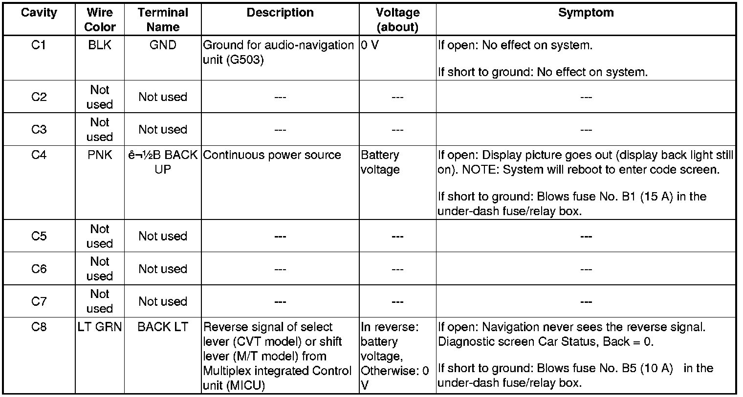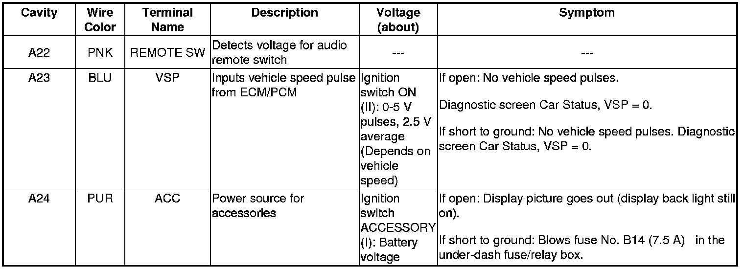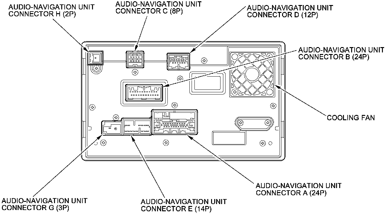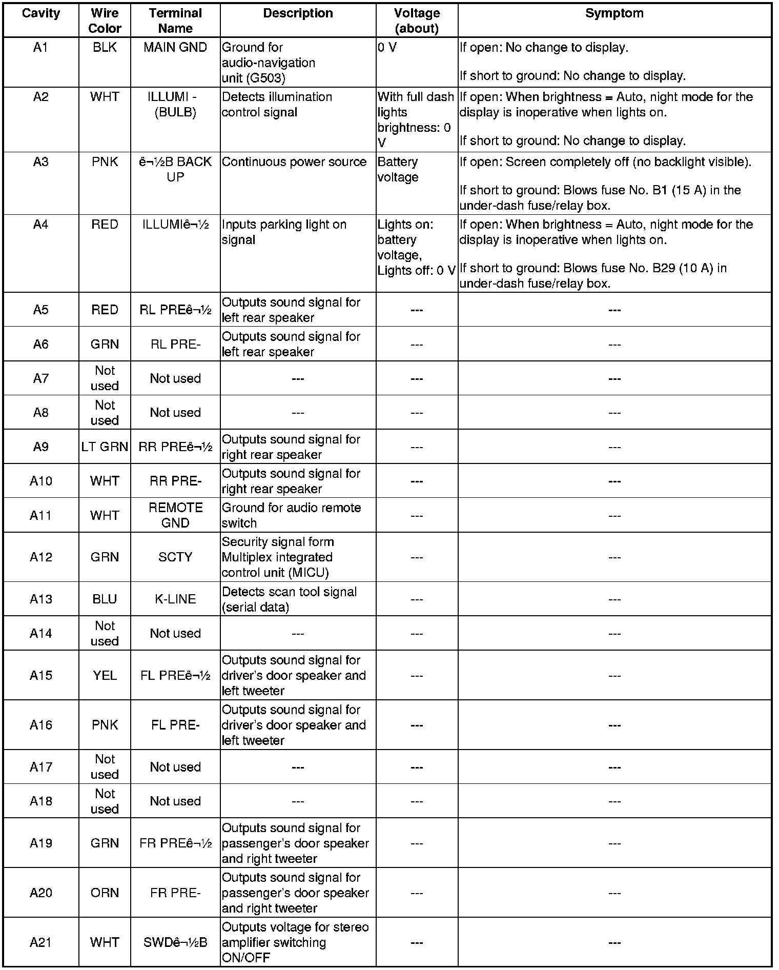 NOTE: Refer to the audio section for audio-navigation unit connector E and G inputs and outputs.
