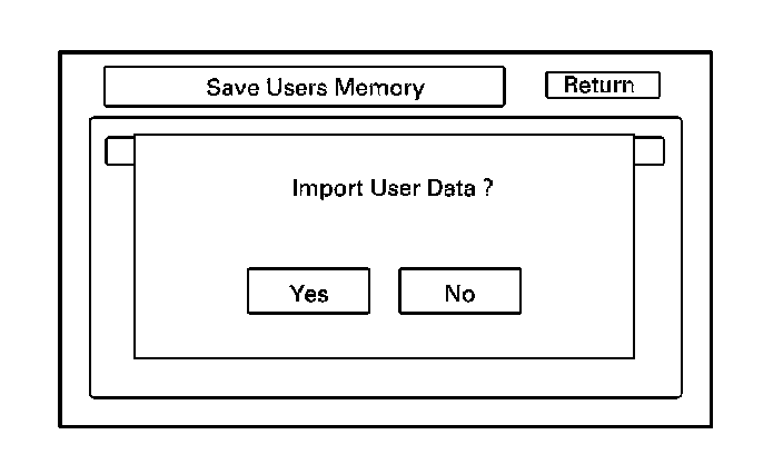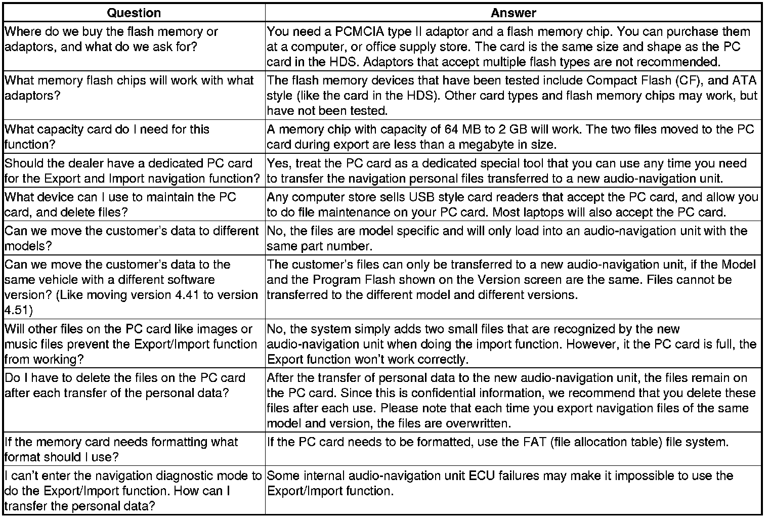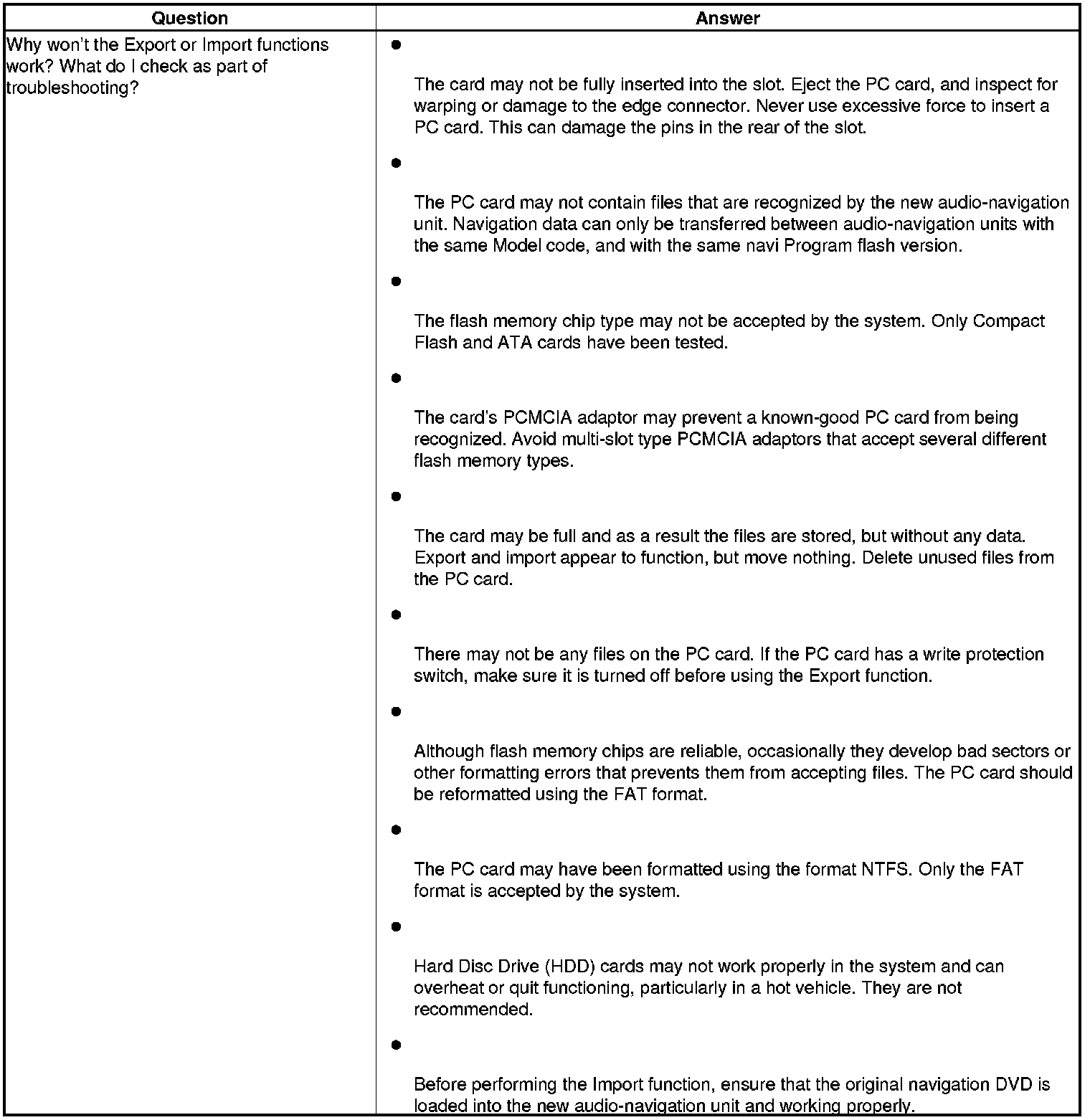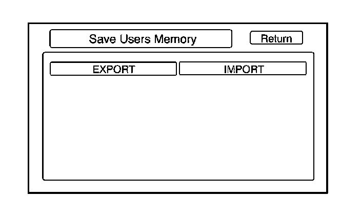 When replacing the audio-navigation unit, this function allows the technician to transfer the customer's personal data to the new audio-navigation unit. The transferred information includes customer setup settings and personal addresses. The dealer inserts a PC card into the audio-navigation unit, and then selects the Save Users Memory function. The two functions in this diagnostic screen are EXPORT and IMPORT. EXPORT saves the customer's data to the PC card, and IMPORT moves the PC card files to the new audio-navigation unit.