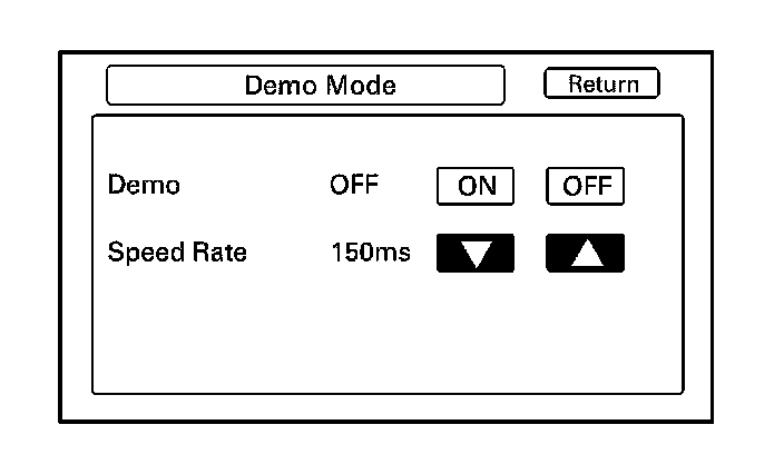 This screen is for factory use only, and should always be set to OFF. Occasionally the DEMO setting is turned ON when vehicles are being used at Auto Shows or similar events. Turning this feature on, allows the navigation system to automatically follow a route to a destination when the vehicle is stationary. The Speed Rate changes the speed of the demo mode.