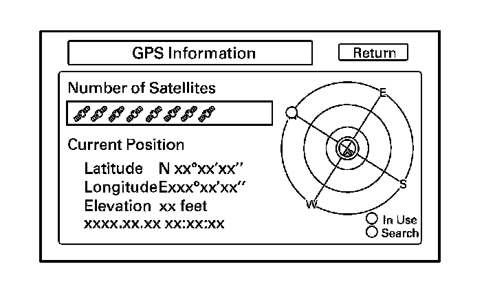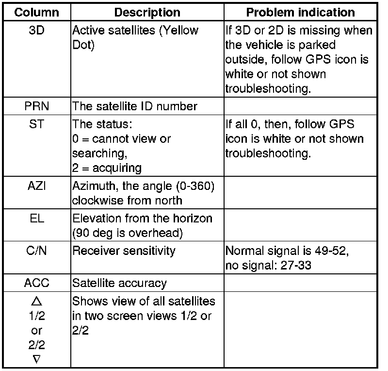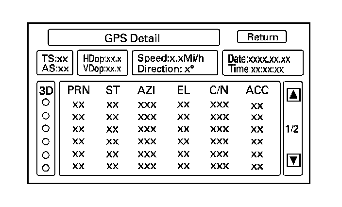 By pressing and holding the MENU button for 2 seconds, a GPS Detail screen appears. This screen displays real time incoming satellite positional data when the vehicle is outside in the open. The information shown on this screen is for factory use.