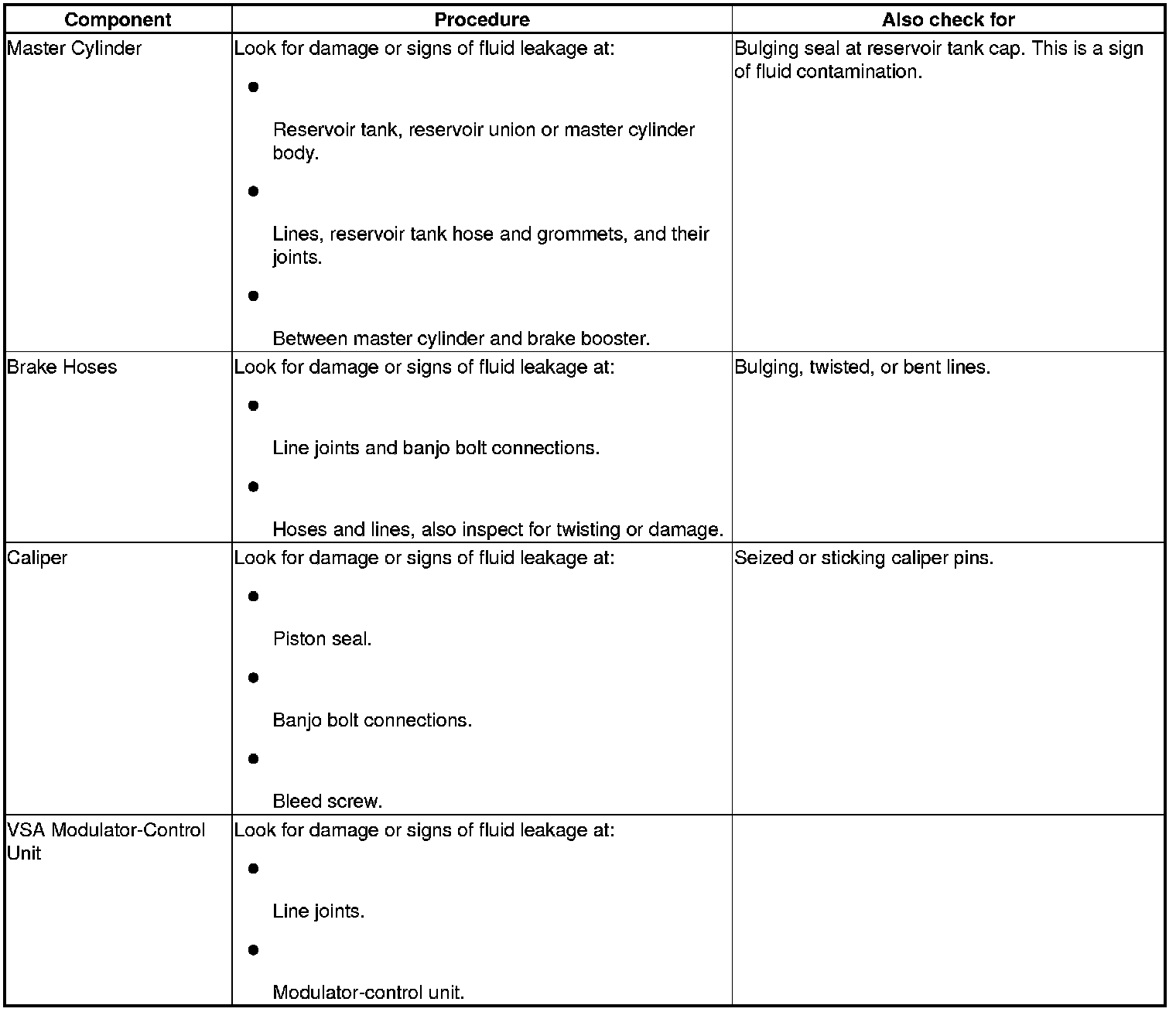 Inspect the brake system components listed. Repair or replace any parts that are leaking or damaged.