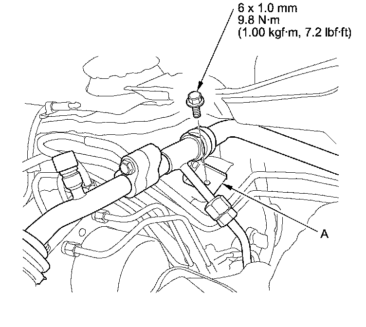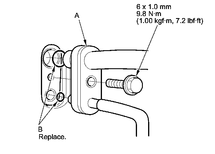 3. Remove the bolt, then disconnect the A/C line (A) from the evaporator core, and the O-rings (B).