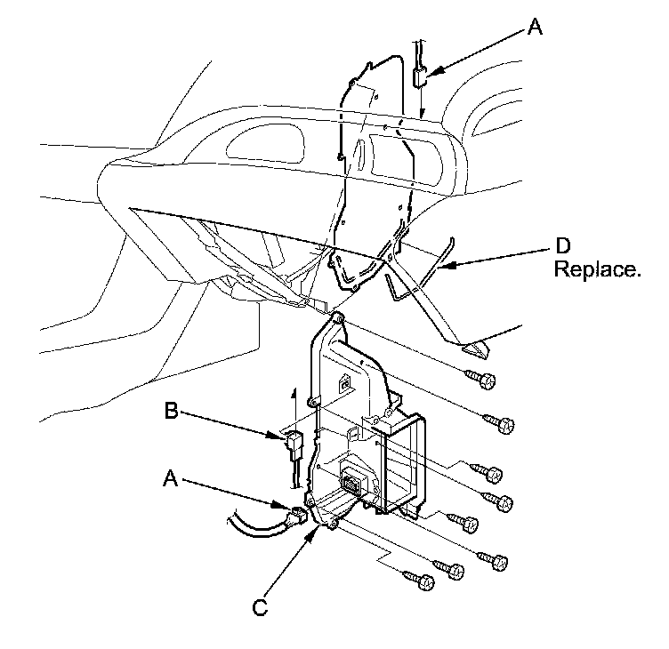 5. Disconnect the connectors (A) from the evaporator temperature sensor and the power transistor, then remove the connector clip (B). Remove the self-tapping screws, the expansion valve cover (C), and the seal (D).