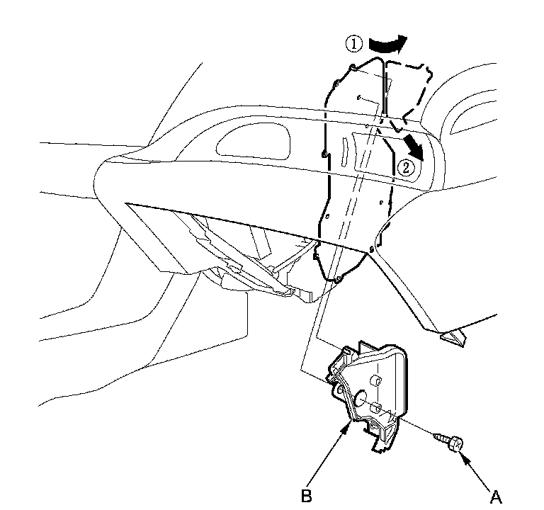 6. Remove the self-tapping screw (A), push the upper cover (B) toward the front of the vehicle, then remove the upper cover.