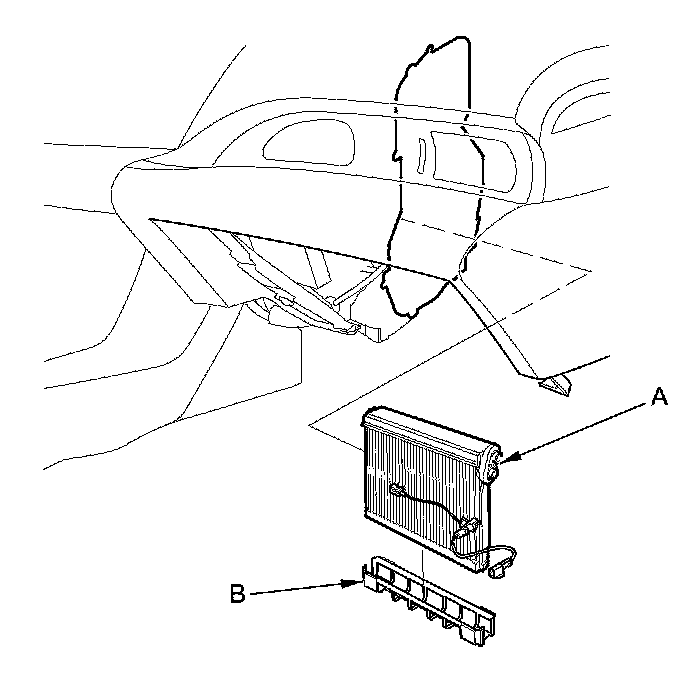 8. Carefully pull out the evaporator core assembly (A), then remove the plate (B).
