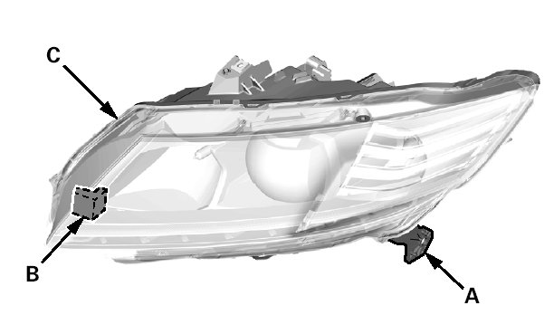 If the lower rear bracket (A) or the lower front bracket (B) on the headlight assembly (C) is broken, the headlight assembly can be repaired using the repair brackets if it meets this criteria: