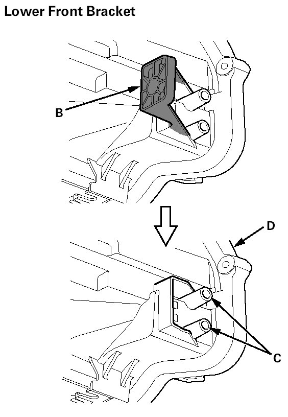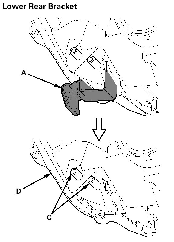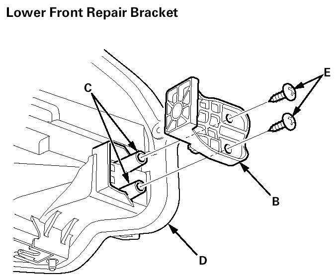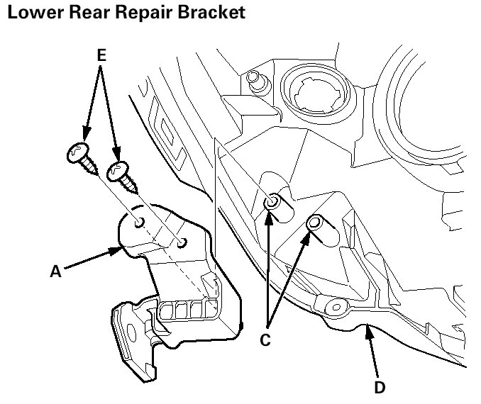 4. Install the lower rear repair bracket (A) or the lower front repair bracket (B) on the bosses (C) on the headlight housing (D), then fasten it with the screws (E) provided with the repair bracket.