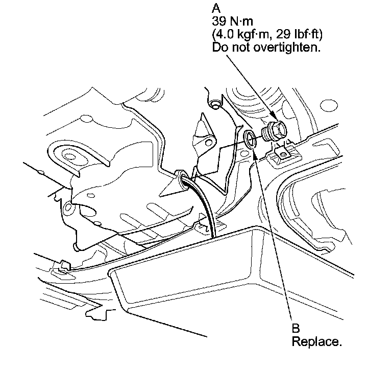 4. Reinstall the drain bolt with a new washer (B) and torque to specification.
