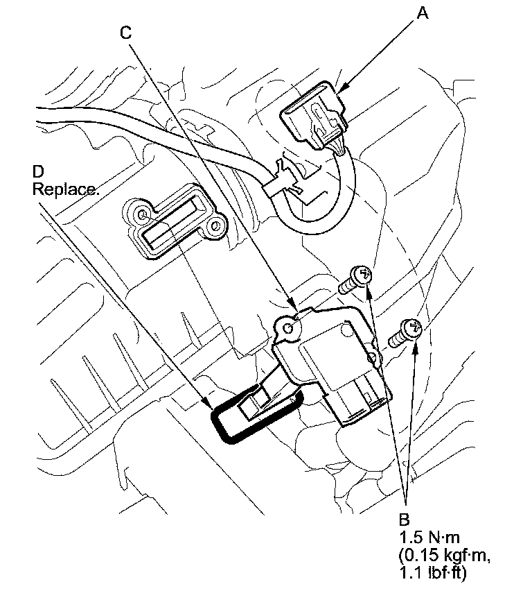 4. Install the parts in the reverse order of removal with a new gasket (D).