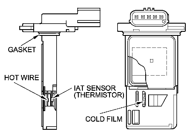 The mass air flow (MAF) sensor/intake air temperature (IAT) sensor contains a hot wire, a cold film, and a thermistor. The sensor is in the intake air passage. The resistance of the hot wire, the cold film, and the thermistor changes due to intake air temperature and air flow. The control circuit in the MAF sensor controls the current to keep the hot wire at a set temperature. The current is converted to voltage in the control circuit, then output to the ECM/PCM.