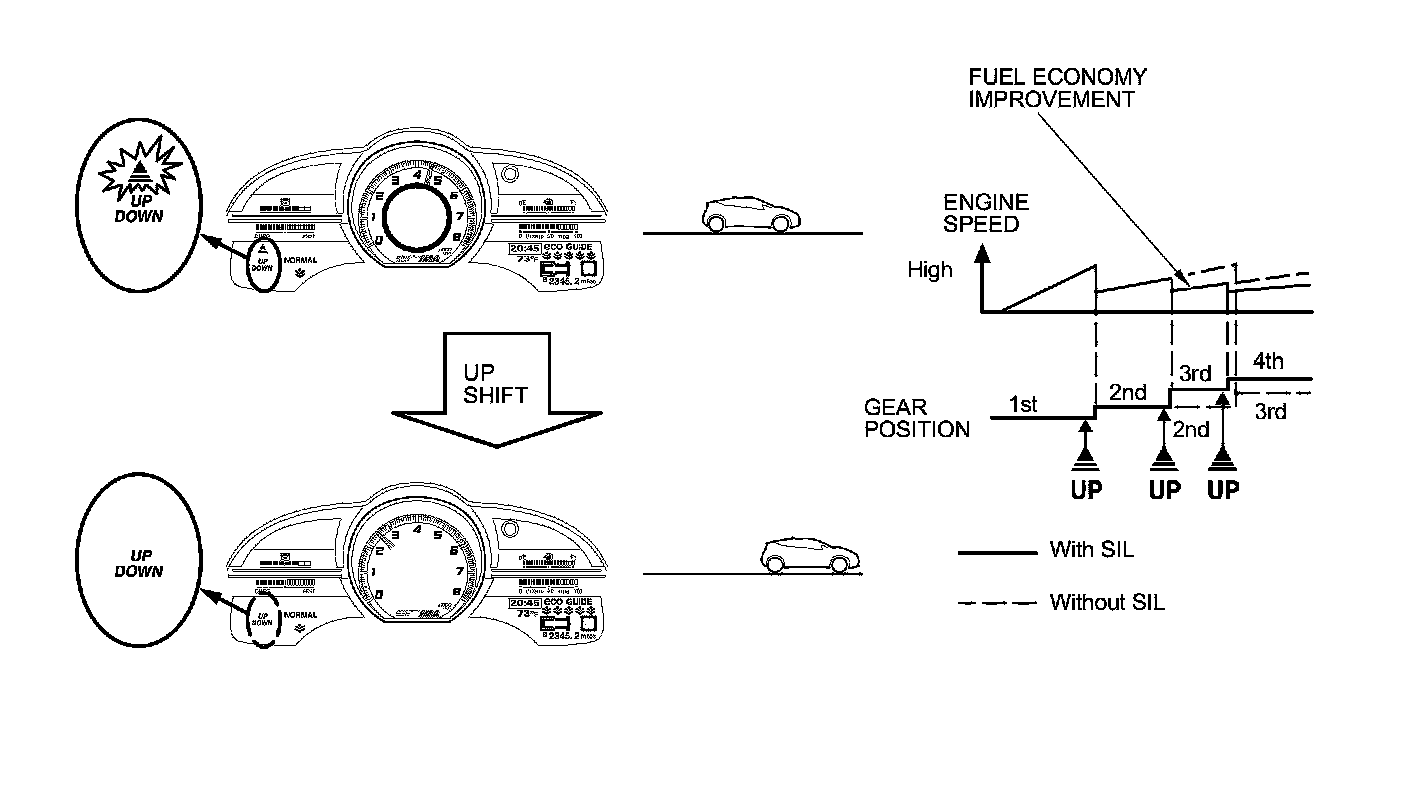 The down shift indicator prompts you when to shift to a lower gear to prevent the engine rpm from being too low when the vehicle is climbing a hill, or for faster accelerating on a flat road. To avoid sudden engine braking, the SIL does not prompt downshifts to 1st gear.