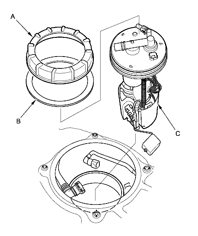 7. Remove the locknut (A), the locknut plate (B), and the fuel tank unit (C).